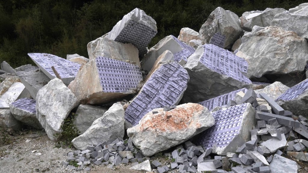 Marblemumbles est une exploration de la dégradation urbaine et de la résilience naturelle, se déroulant dans une carrière de marbre. Des affiches en papier représentant des façades d’immeubles sont appliquées sur un tas de pierres de marbre, formant une ville nouvelle qui semble à la fois construite et mystérieusement détruite.